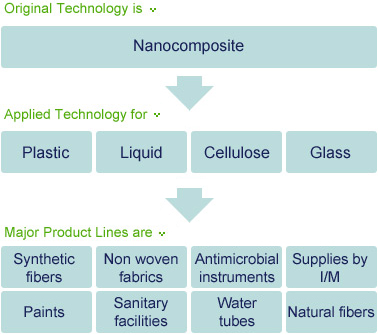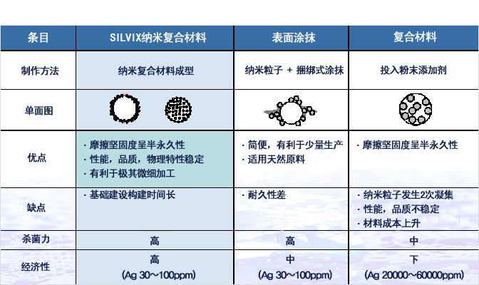 是SILVIX(株式会社)正在研究的纳米复合材料中,最先作为商用产品上市的是“具有抗菌性能的纳米复合材料”。相对于单纯的将表面涂抹纳米凝胶银的方法相比“SAN”具有保持半永久性耐久性的优点,相对于抗菌剂加工时单纯添加的方法达到了均质性的级别。再进一步可以使材料在热等化学刺激之下发生改变性质的情况最小化,以确保新型材料的物理特性。